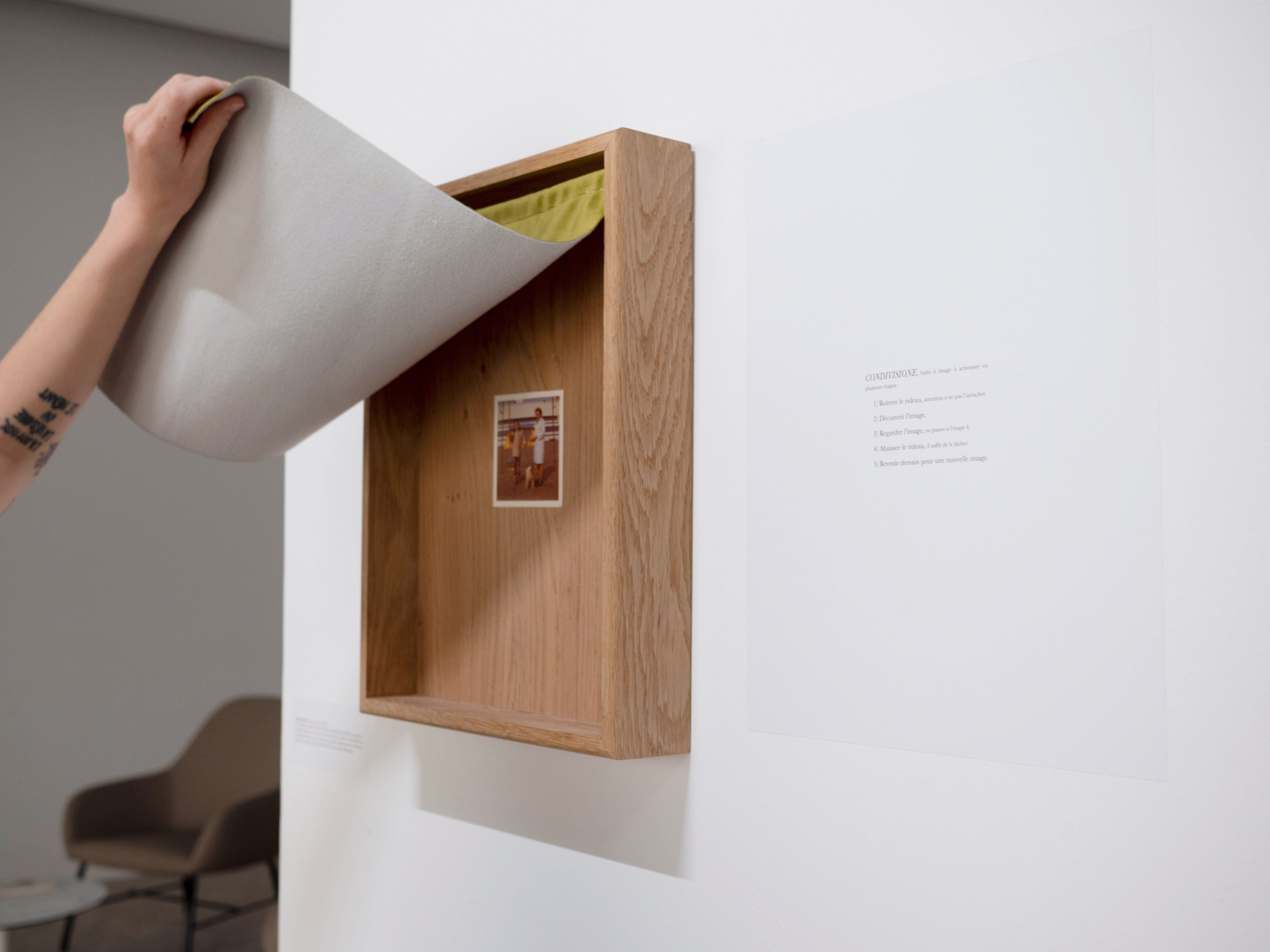 Dispositif plastique pour l’activation d’images. Chaque jour, une nouvelle photographie de famille issue de ma collection personnelle est exposée. L’image change, mais le cadre reste : un rideau la masque partiellement, en devient le seuil. Le spectateur est invité à regarder, à déplacer son regard, à soulever — symboliquement ou physiquement — ce qui fait écran.